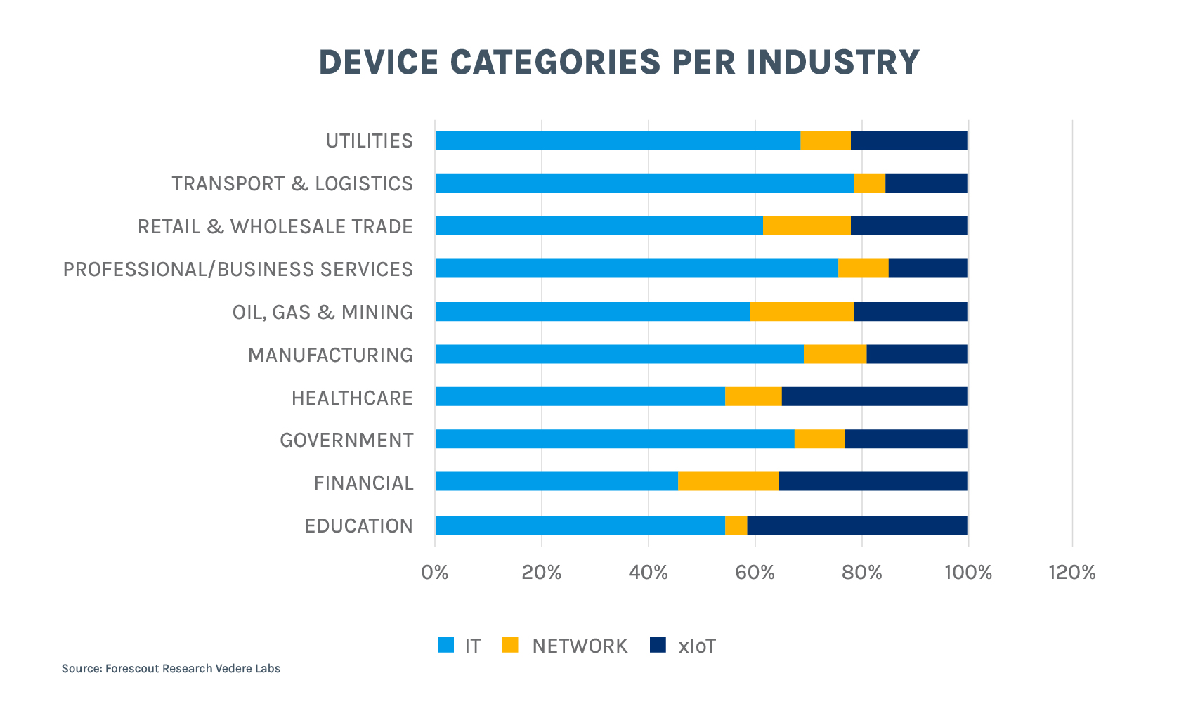 The figure below shows xIoT ‘penetration’ per industry – measured as the percentage of xIoT devices among all devices observed in that industry in our dataset.