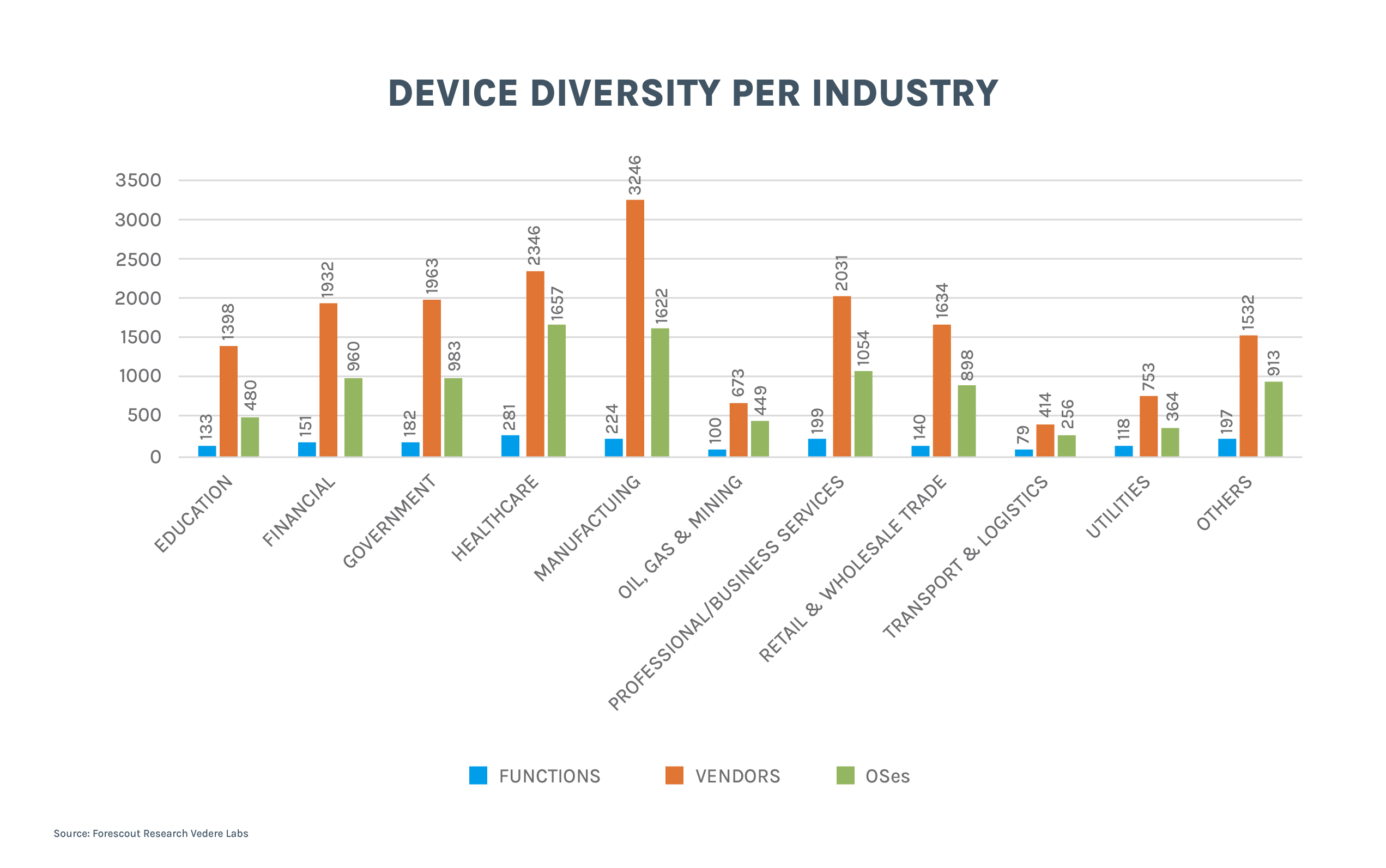 - Industries with more extended IoT security risks have higher device diversity (more device functions, vendors, and operating system flavors). In our dataset, there were:
