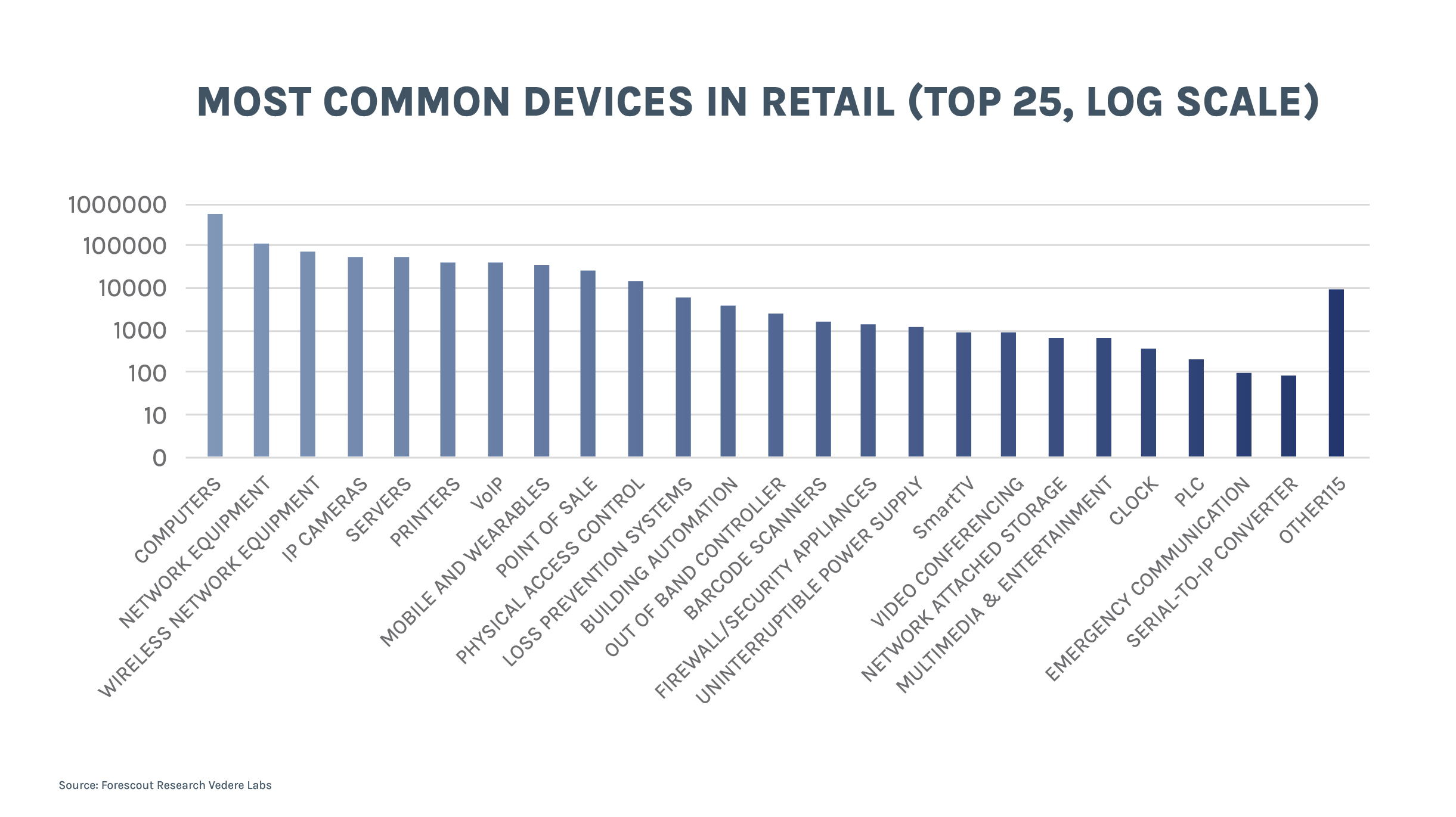 The figure below exemplifies this ‘long tail’ for the retail industry which sits in the middle of the diversity scale, so it’s a good representative (and was the riskiest industry in our riskiest devices report this year).