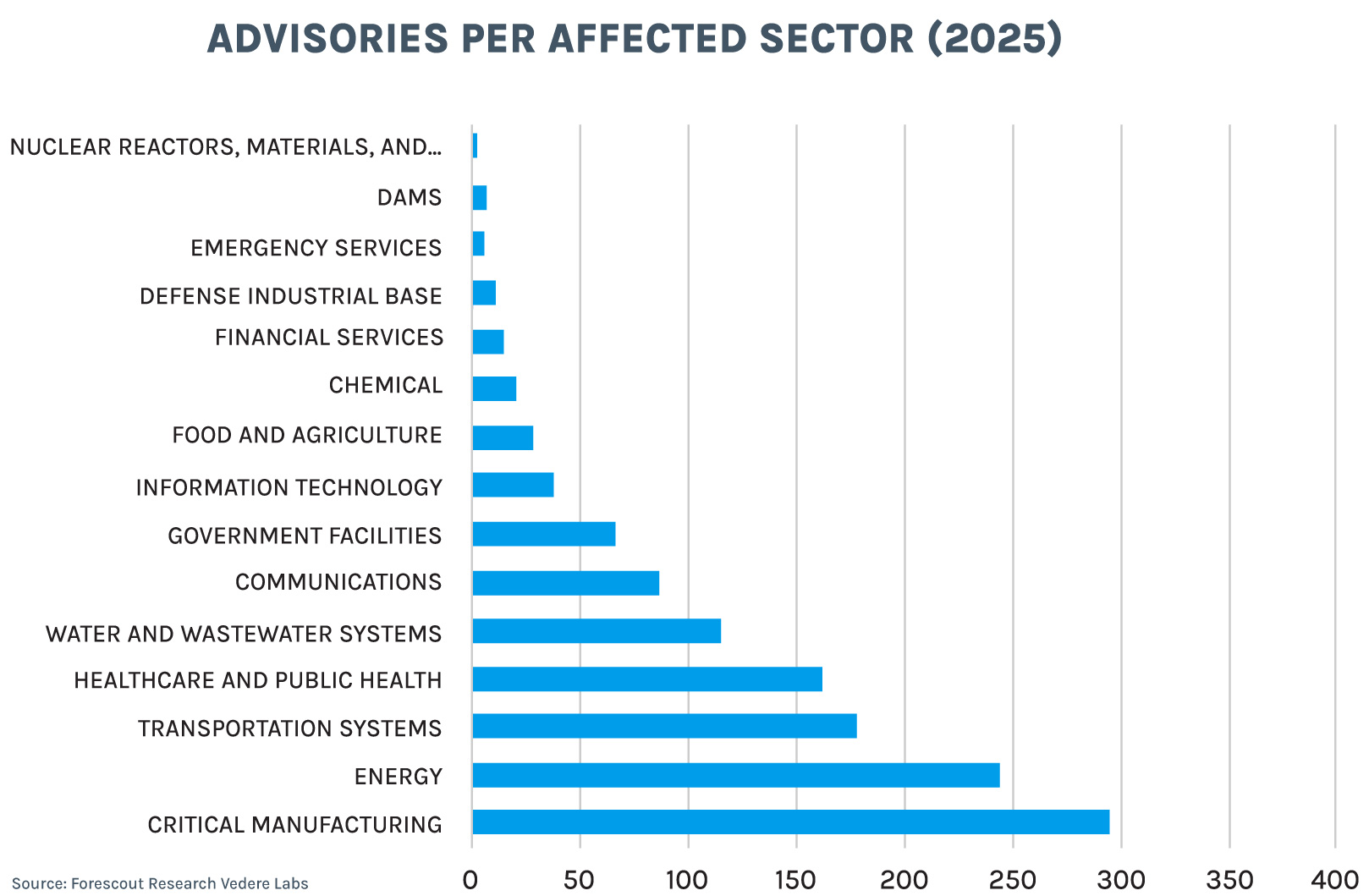 When we look at where these assets are used (as documented in ICSA publications), we see that manufacturing and energy have been the top two most affected sectors last year and over time. Historically, water and wastewater were the third most affected sector, but in 2025 that spot was taken by transportation. Another notable change is that healthcare jumped from the eighth most affected sector over time to fourth last year.