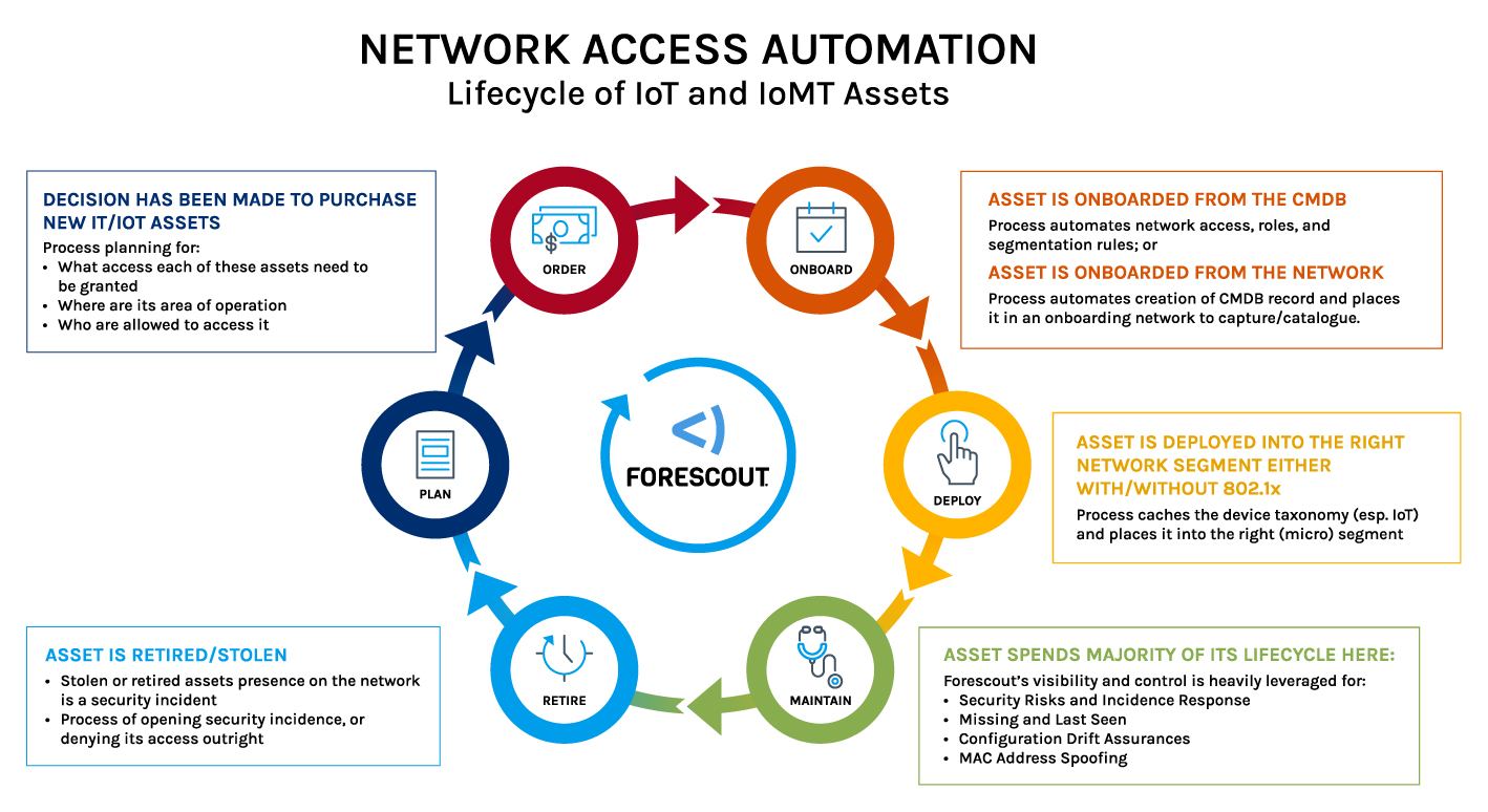 Consider a healthcare organization deploying numerous medical IoT devices that lack traditional management interfaces. Using Forescout, the organization can either:
