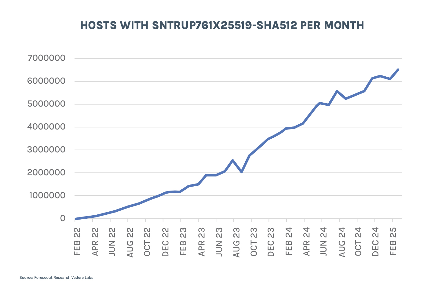 - sntrup761x25519-sha512 grew by 30% in the six months between April and October 2024 — and by a further 21% in the six months between October 2024 and March 2025.