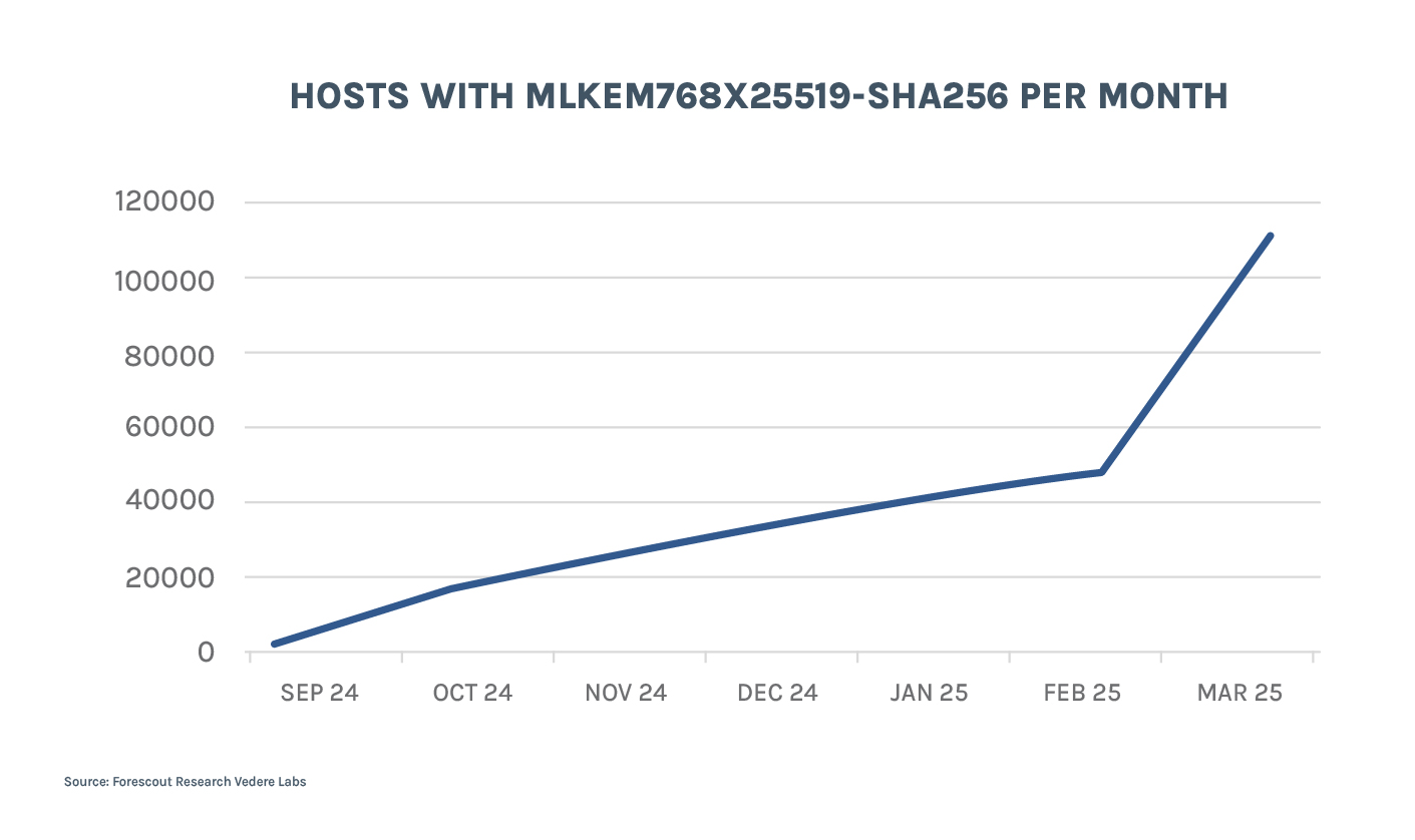 That number is growing fast despite it not being a large percentage. The figures below track the evolution of hosts supporting the two most popular PQC algorithms: