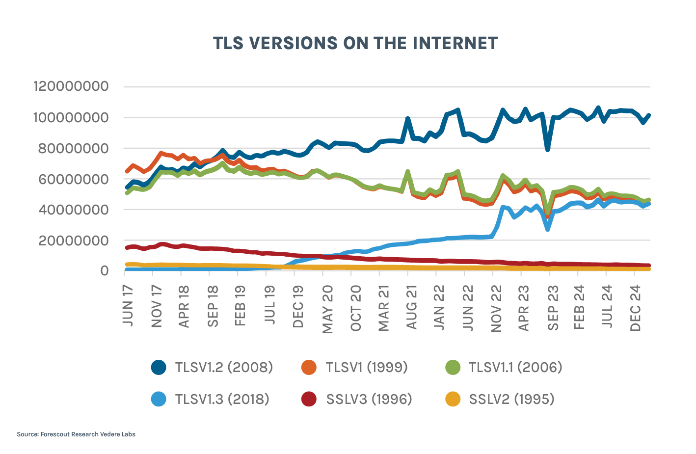 For TLS, we could not directly measure the new algorithms being supported by servers and clients, but we used TLS version as a proxy for that information.
