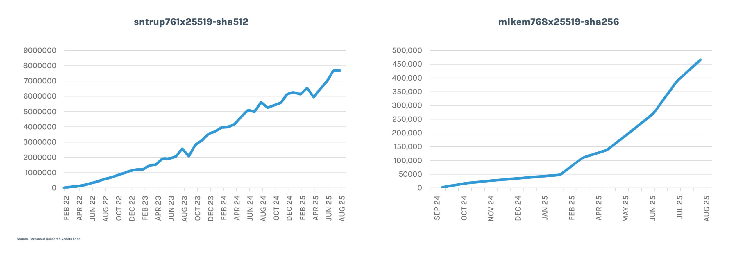 - Support is growing on the standardized algorithms. In April, we still saw several experimental algorithms marked with vendor extension names such as “@openquantumsafe” and “@amazon”. We don’t see those anymore. There are still a few entries marked as Kyber and FrodoKEM, which tend to disappear, since the largest growth is in the two most popular PQC KEX. As the figure below shows, sntrup761x25519-sha512 grew by 17% between April and August, while mlkem768x25519-sha256 grew by 323% in the same period.