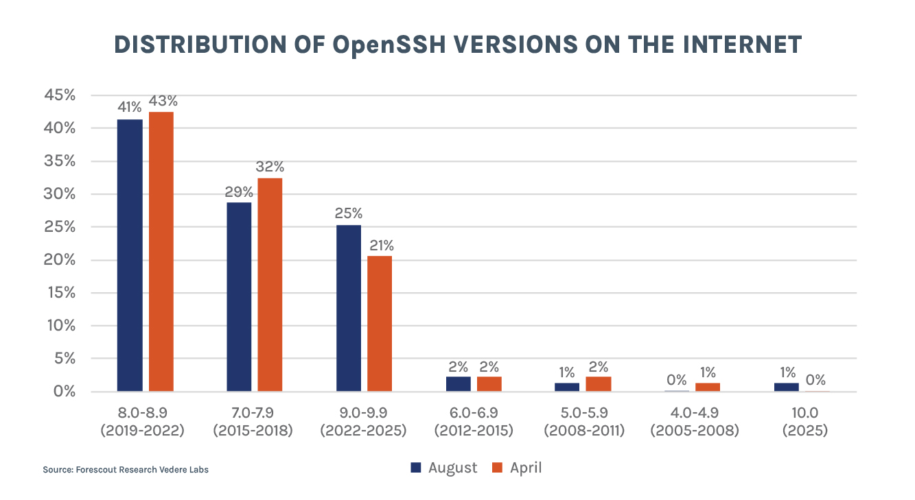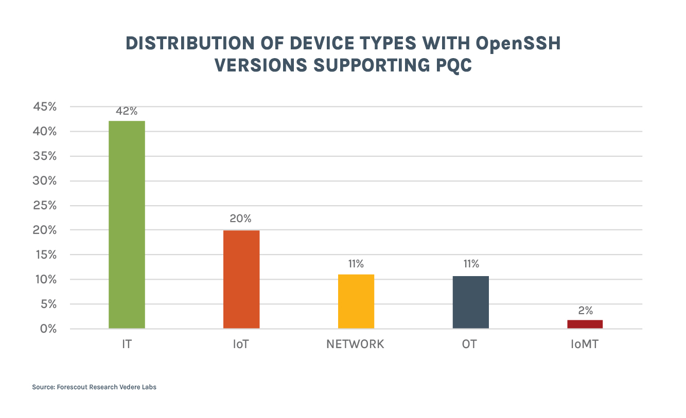 - Unmanaged devices are getting left behind. While more than 40% of IT assets using OpenSSH already run versions supporting PQC, that number decreases to 20% for IoT, 11% for OT and network equipment, and only 2% for IoMT.