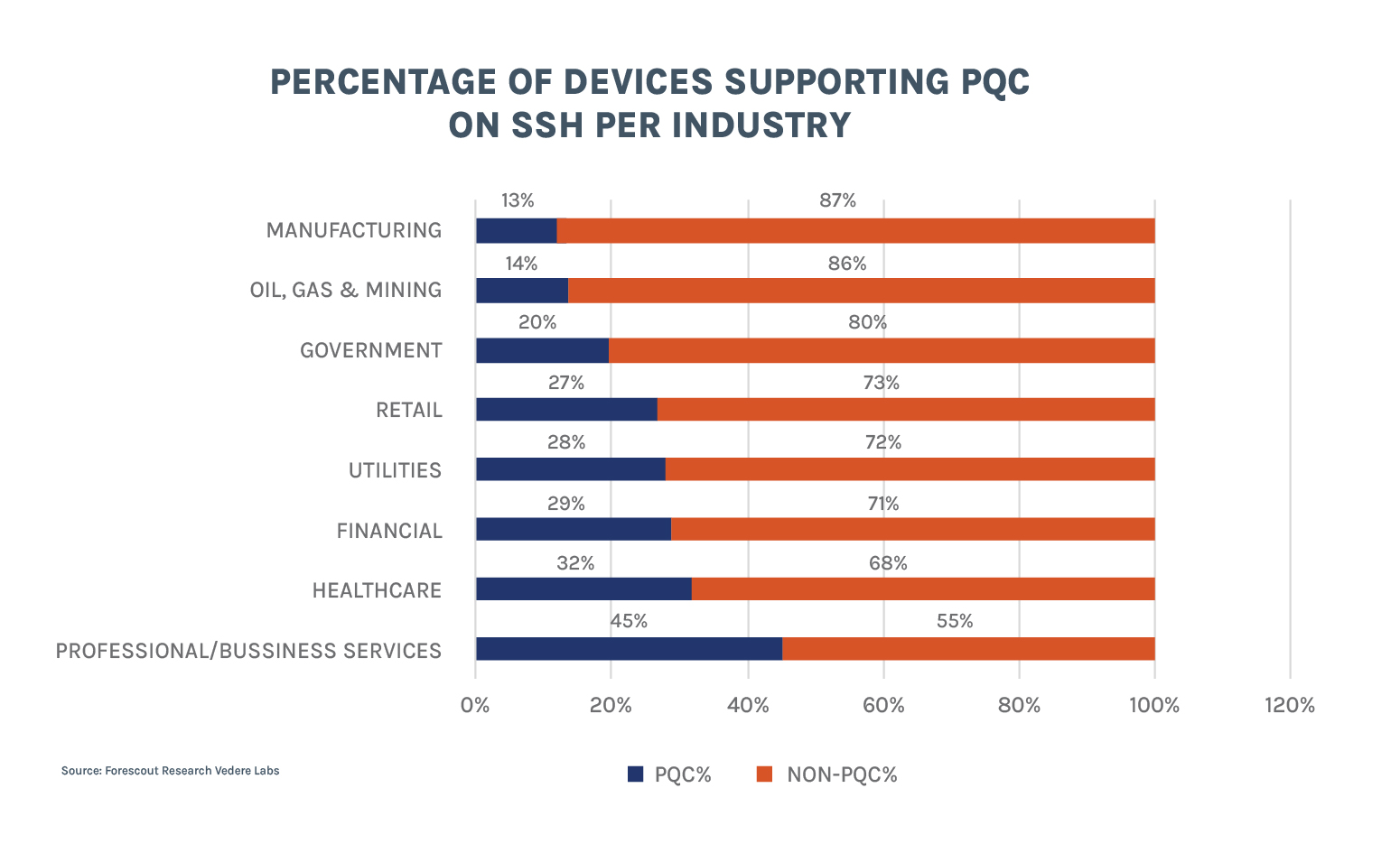 - Industry adoption is uneven. Every industry we track has less than 50% of devices with OpenSSH supporting PQC. Industries that more heavily rely on unmanaged devices, such as manufacturing, oil and gas, and mining have the lowest PQC adoption rates. The highest rate was seen on professional/business services.