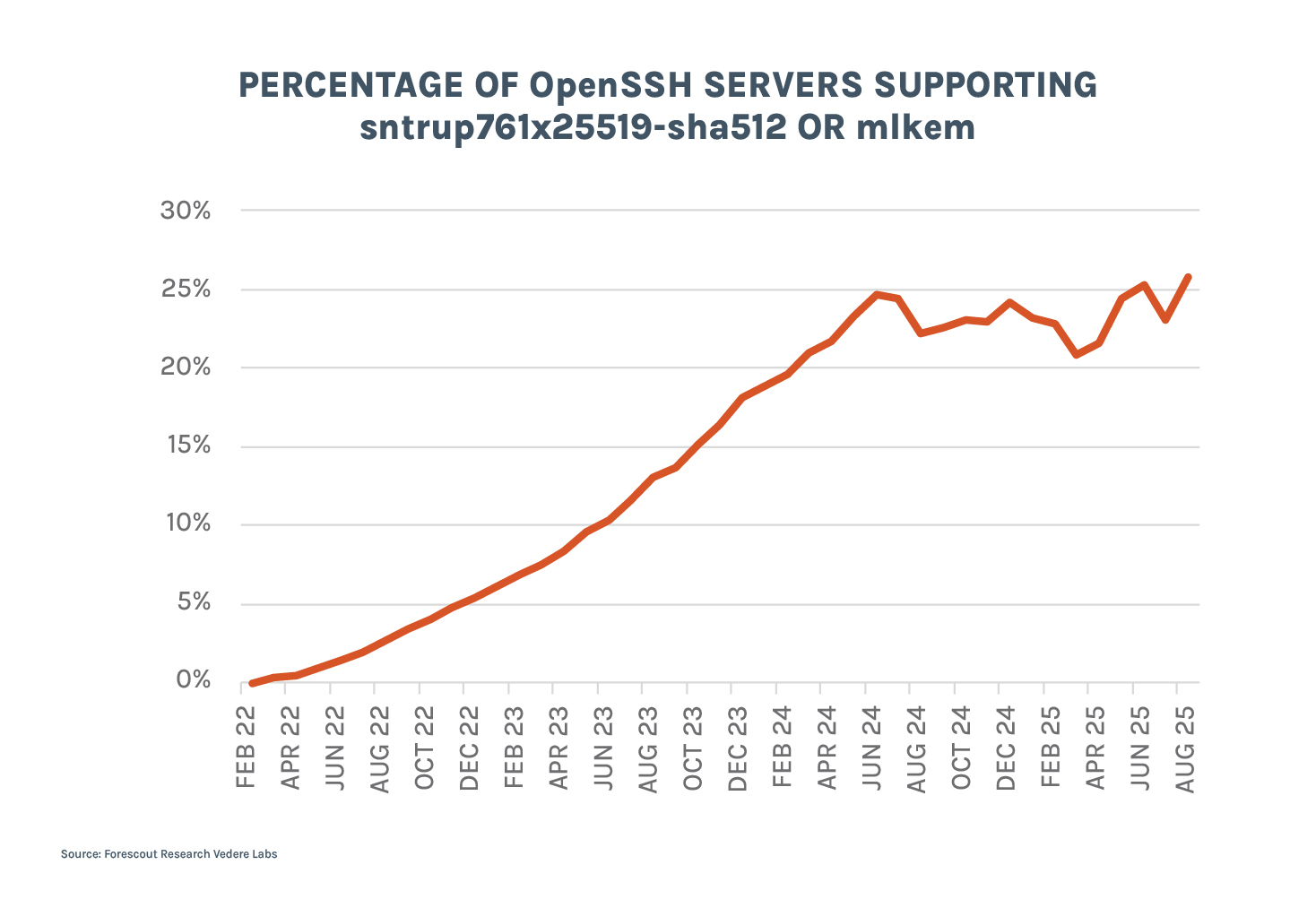 As expected, the percentage of SSH servers on the internet with a default PQC KEX is still growing, but at a much slower pace than between 2022 and early 2024 when the first OpenSSH versions supporting PQC were released. It finally broke out of the 20-25% plateau we identified in our original research (now 26%), but there is still a long way to go until most SSH servers on the internet are quantum-safe.