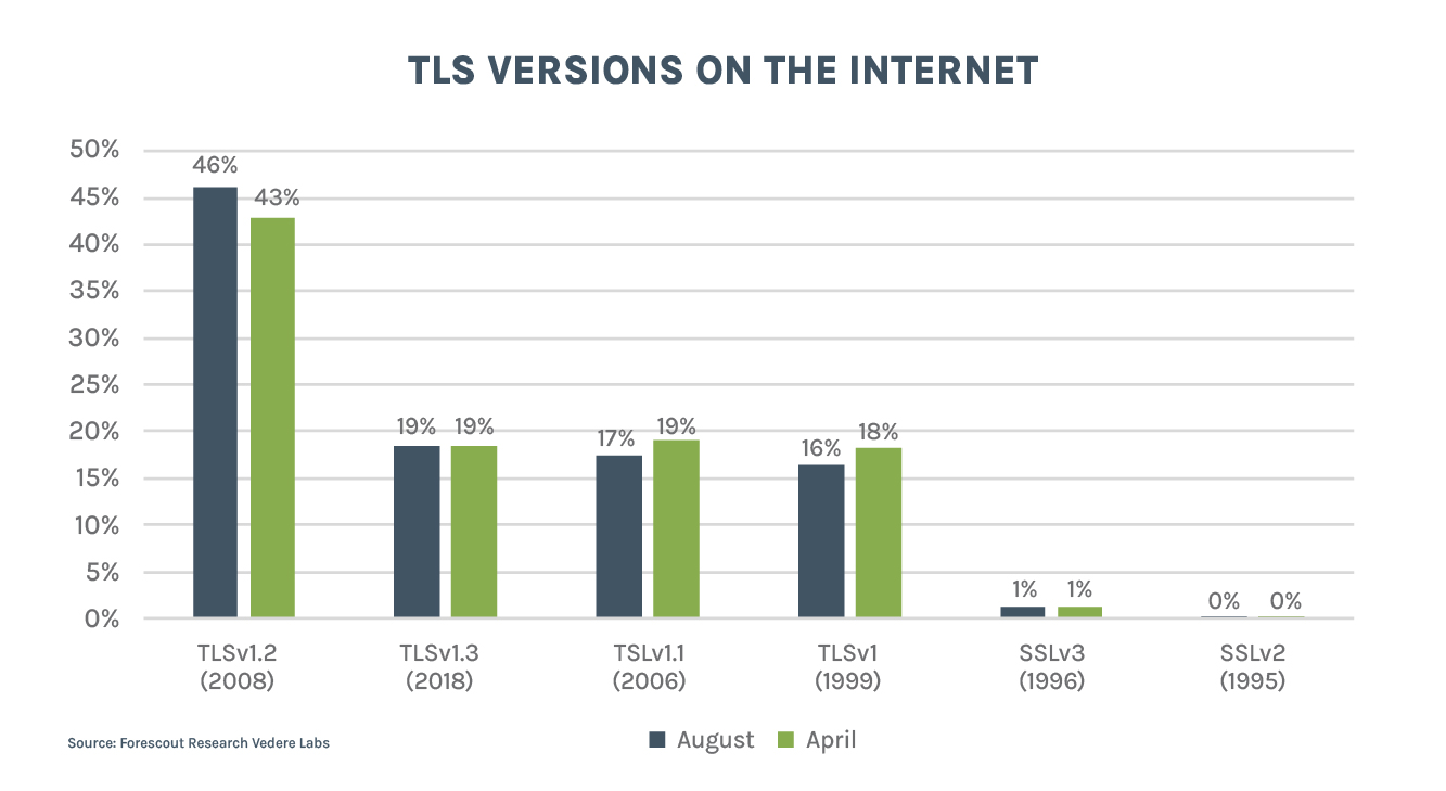 That blog analyzed data available at the end of April. Now, we extend this dataset to the end of August combined with data from Forescout’s Device Cloud — our repository of detailed information about monitored assets. Here, we want to understand what devices have already migrated and what industries are ahead in the PQC transition. Our new data shows: